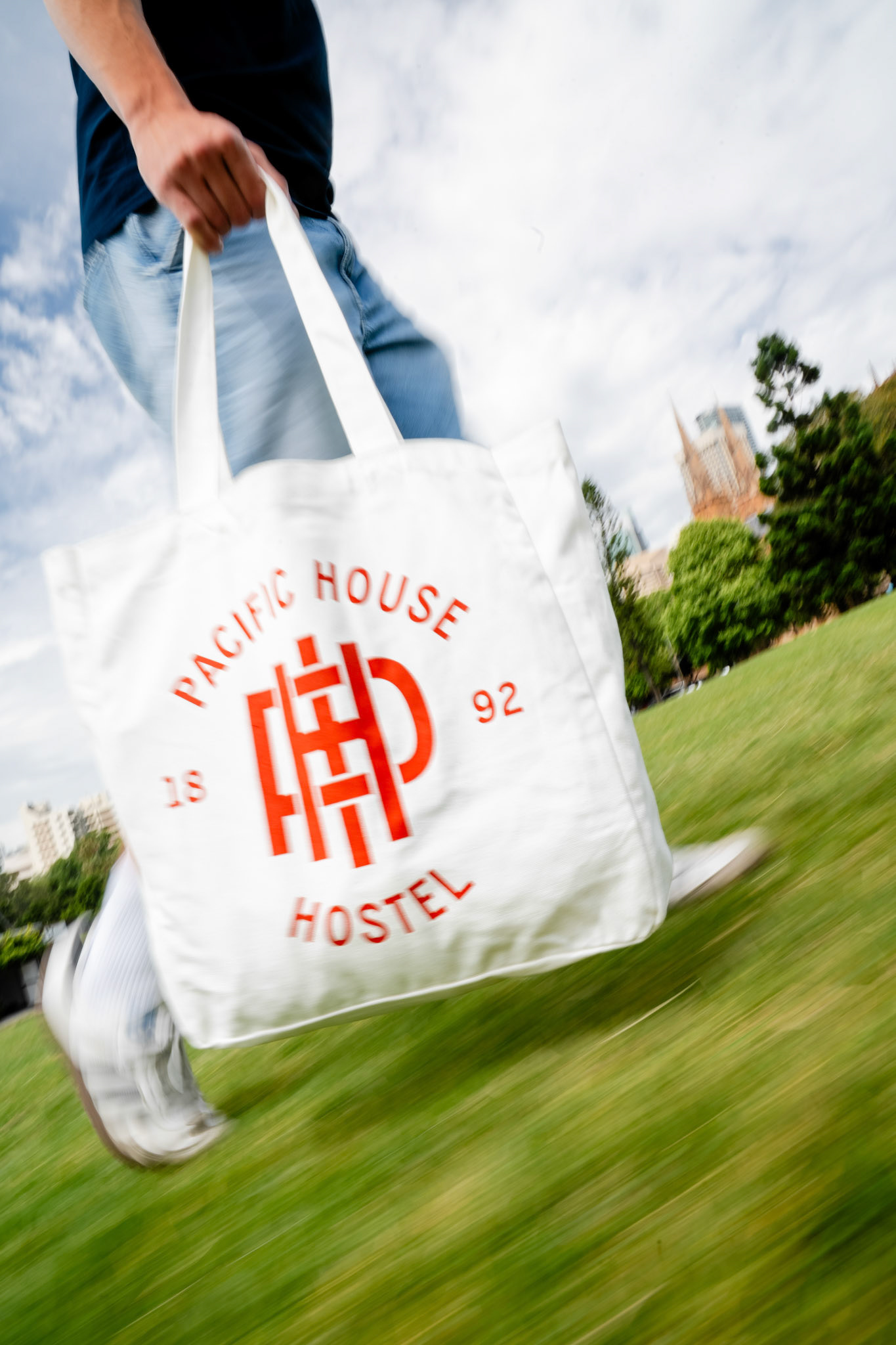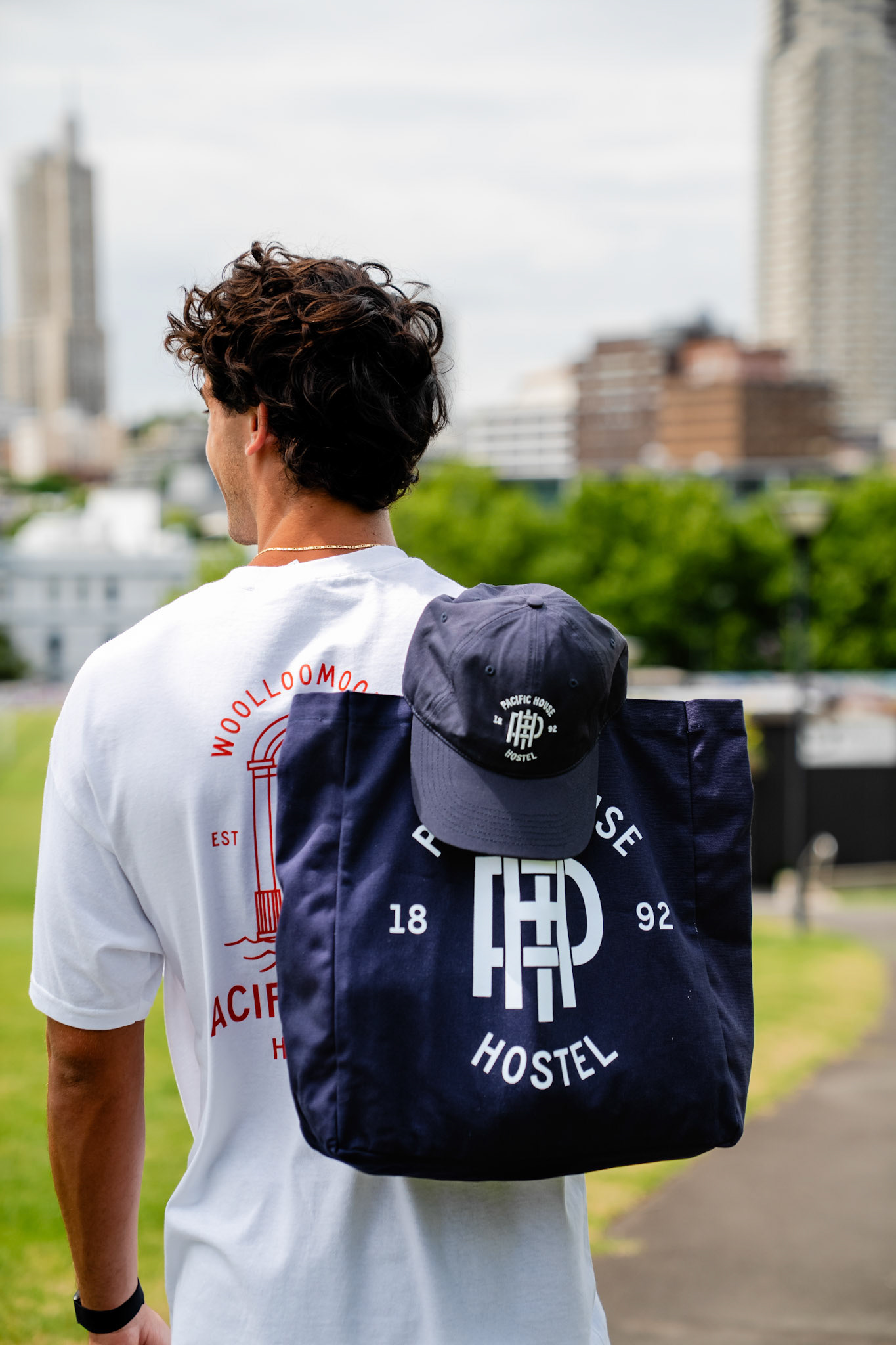 Photo production created for Pacific House in Sydney, showcasing apparel and accessories. The images blend urban greenery with the city skyline, balancing nature and lifestyle.